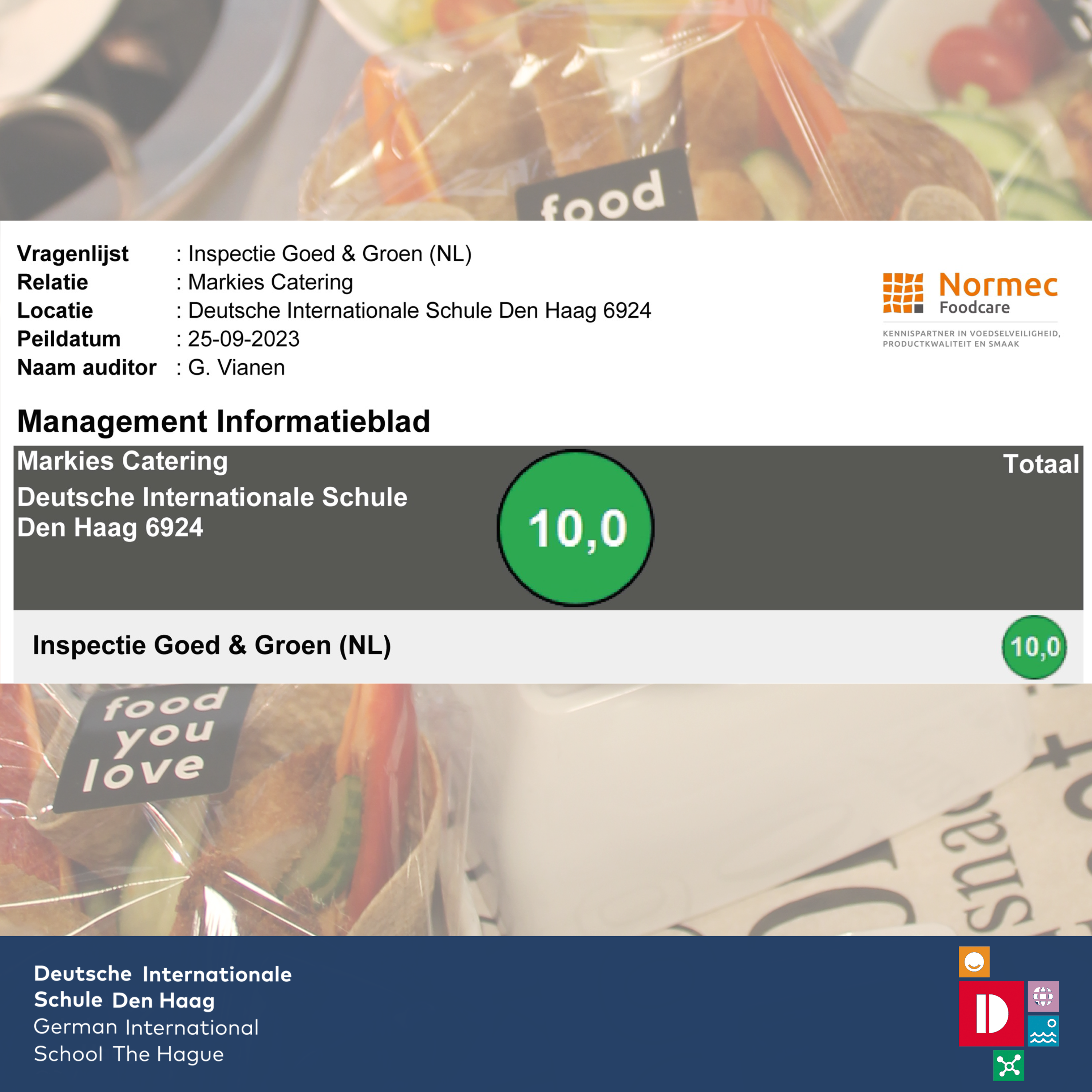 Unsere Mensa wurde von einer unabhängigen Stelle nach dem Hygienekodex für die Gemeinschaftsverpflegung der NVWA (Niederländische Behörde für Lebensmittelsicherheit) geprüft. Es wurden stolze 10 von 10 Punkten in jeder Kategorie…